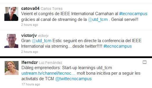 L’èxit de l’experiència i la voluntat d’obrir a la xarxa aquelles activitats interessants que es duen a terme en un espai físic concret del Tecnocampus, va portar a emetre en directe les sessions de dijous i divendres del Carnahan Conference on Security Technology i el Diàleg emprenedor amb Manel Sarasa amb un total de 44 connexions i prop de 15 hores vistes.