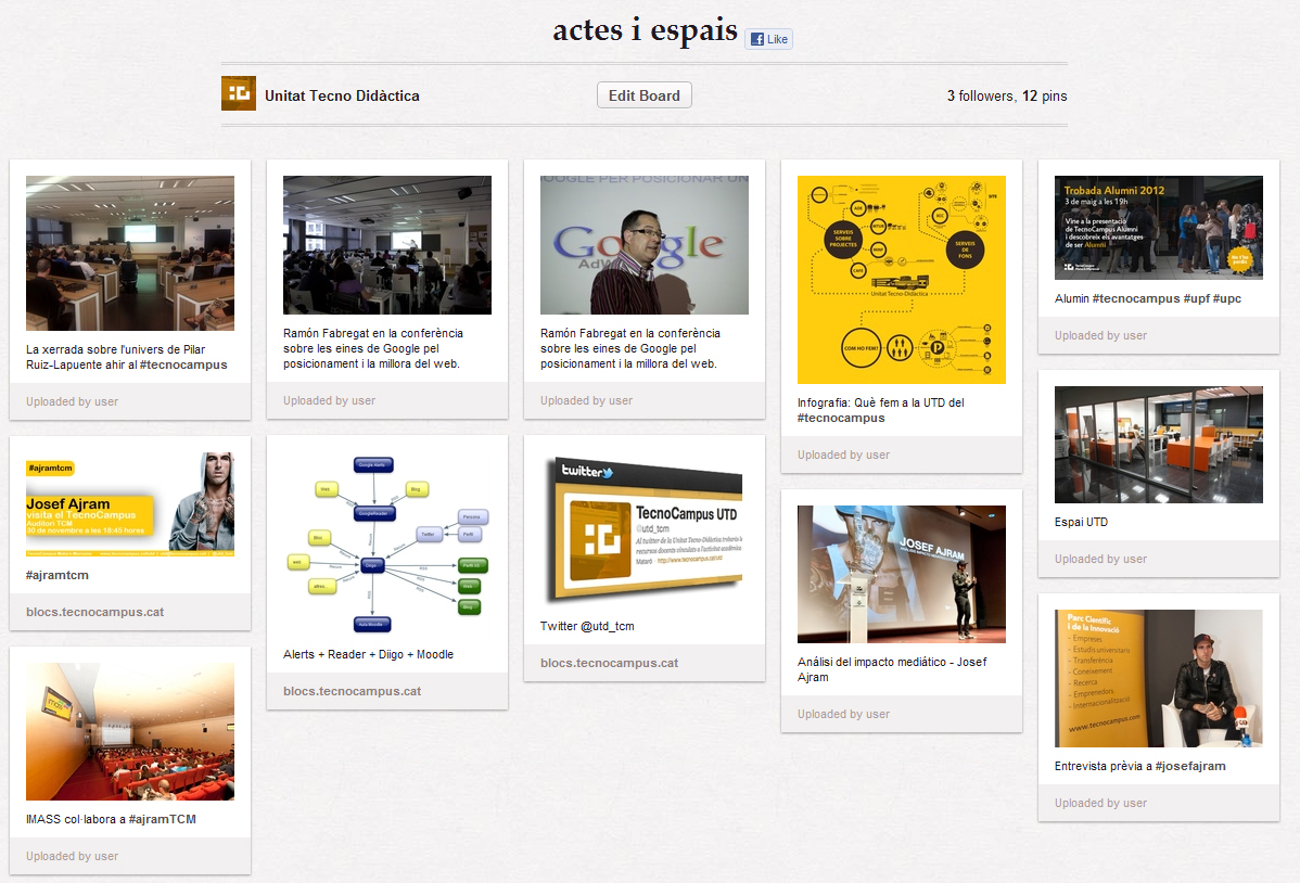 - Perfil a Pinterest: Aquest perfil ha estat creat aquest curs acadèmic amb dos objectius. Per una banda, explorar aquesta xarxa social que ha crescut exponencialment des de la seva aparició i que representa un híbrid entre el que pot ser un repositori de continguts audiovisuals i un espai de participació. En aquest sentit, el segon objectiu és precisament aquest, convertir-lo en un espai on tenir els recursos gràfics que usem, per exemple, en el bloc, a l’hora que disposem d’un espai més de difusió del que es fa al TCM.