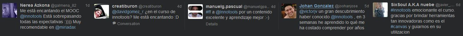 El dia 30 de març l’Informatiu cap de setmana de TVE obria una notícia sobre els MOOC amb imatges d’Inotools (min. 10:48), mentre que a la xarxa, són ja 55.000 les visualitzacions i prop de 100 subscriptors al canal de vídeos docents del Tecnocampus on hi ha els materials del curs en obert. També a twitter, on el perfil @innotools compta amb 675 seguidors en quatre setmanes, el més destacat és la interacció que proporciona aquesta xarxa social permetent, per exemple, la resolució d’incidències o la visualització de comentaris i opinions a mida que va avançant el curs.